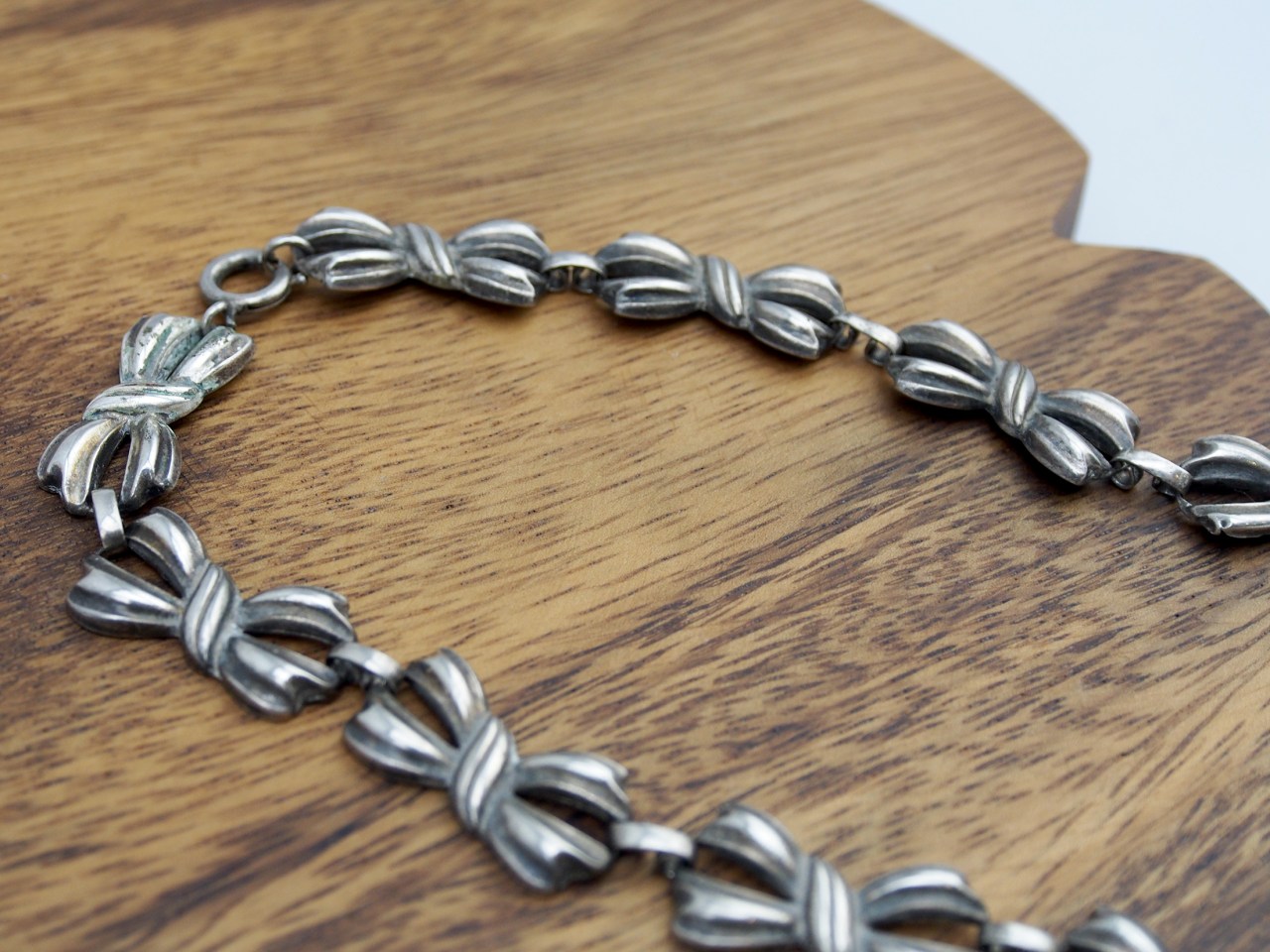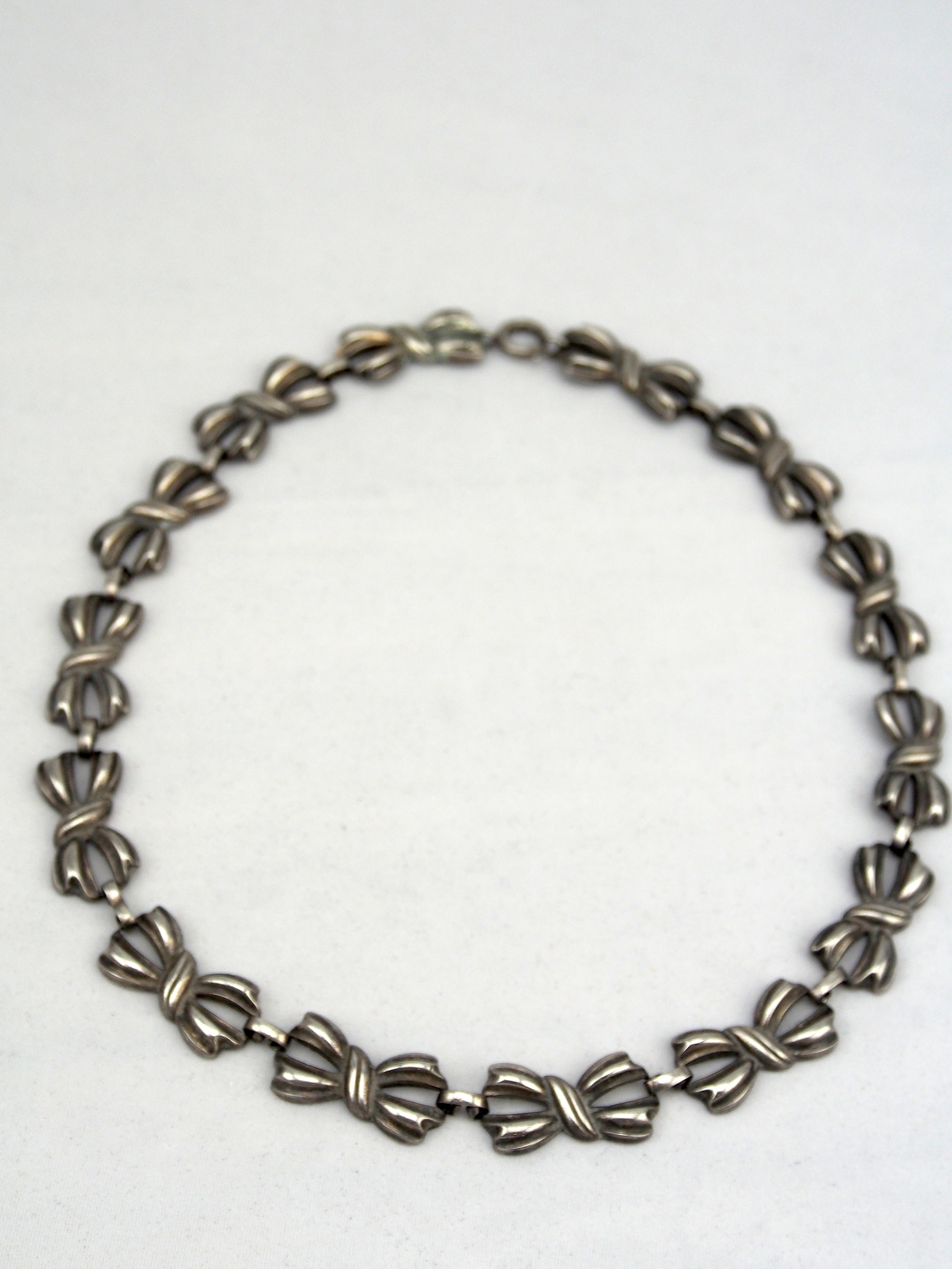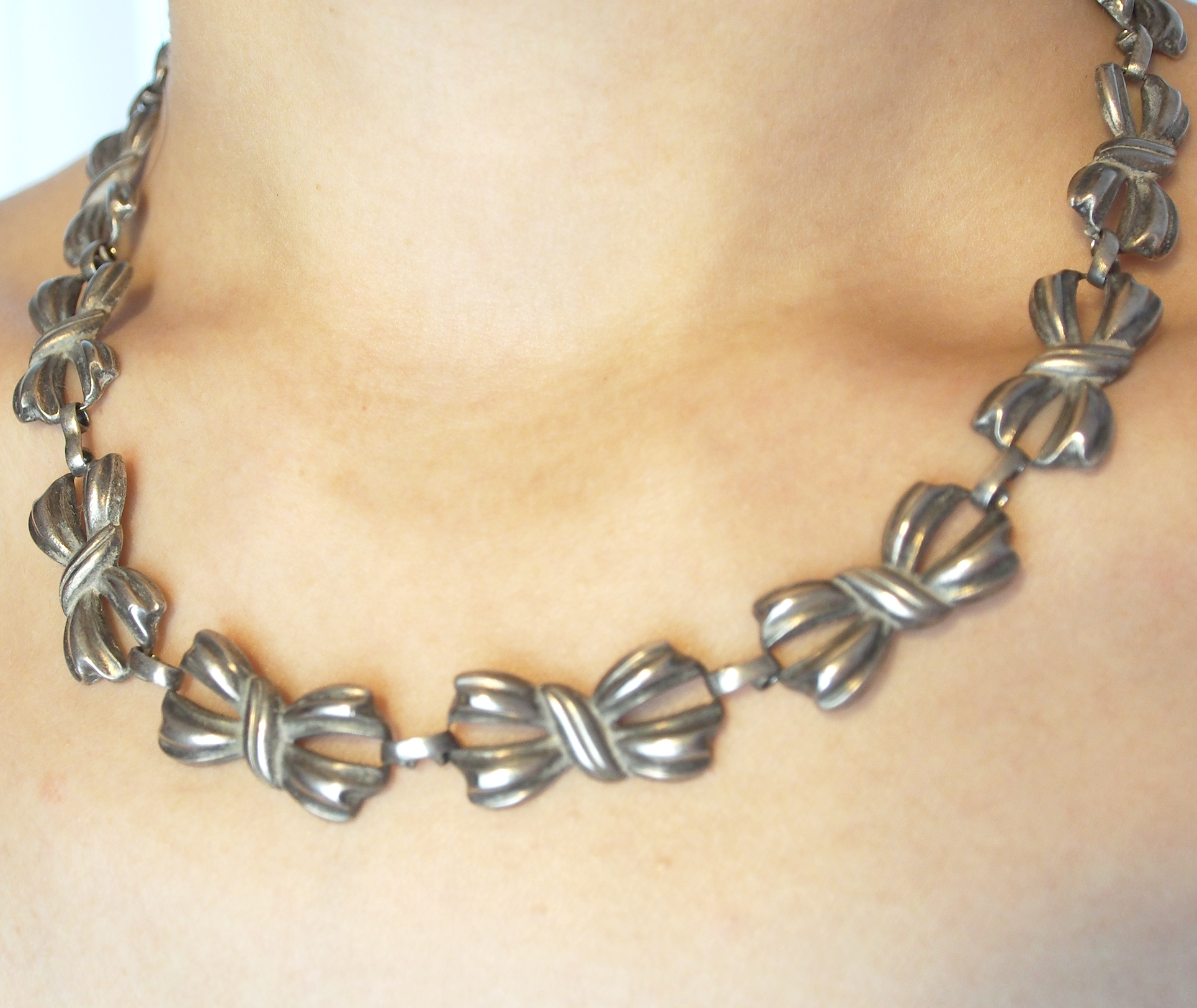 蝴蝶.結/項鏈 Bow / Necklace 1940s TWD 3600- Date: 05/02/2014Author: VINLUX Category: 項鍊、Vintage 標籤: 1940、Bow、Copper alloy、czech、鍍銀銅合金、蝴蝶.結、蝴蝶結、項鏈、飾品、jewelry、Necklace、retro、Silver-plated、vintage、古物、古董、復古年代、捷克 文章分頁導航 ← 鉛華/項鏈及耳環組 Round Strasse / Choker & Earrings Set 1990s TWD 2400- 立體派/手鍊 Cubist / Bracelet 1960s TWD 2900- → 蝴蝶.結/項鏈 材質:鍍銀銅合金 產地:捷克 年份:1940年代 長度:約42.5公分 Bow / Necklace / 42.5 cm / Silver-plated copper alloy / Czech / 1940s 蝴蝶形領結在男人身上 向來是一場隆重且緊張的演出 同樣形狀穿戴在女人身上 說的是卻是不一樣的語言 這條retro風格 以蝴蝶連結的鍍銀鏈子說著: 精巧、別緻,不要著急。 分享此文: 按一下即可分享至 X(在新視窗中開啟) X 按一下以分享至 Facebook(在新視窗中開啟) Facebook 喜歡 正在載入...